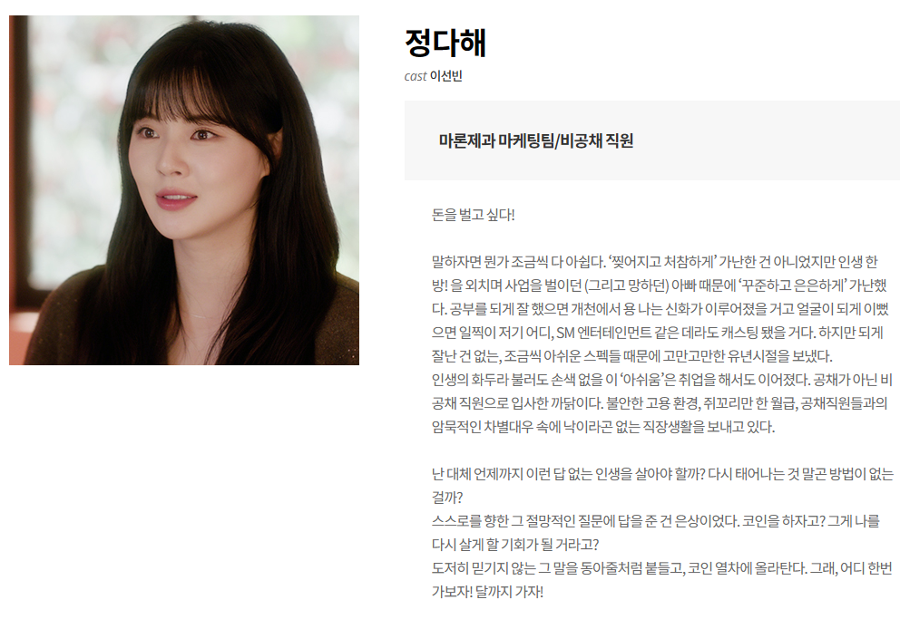 불안정·부조리한 직장에서 시청자와 똑같은 고민을 나눕니다. - 🌱 공감·위로·연대: 시청자 스스로를 위로하는 선택과 책임의 성장 드라마!