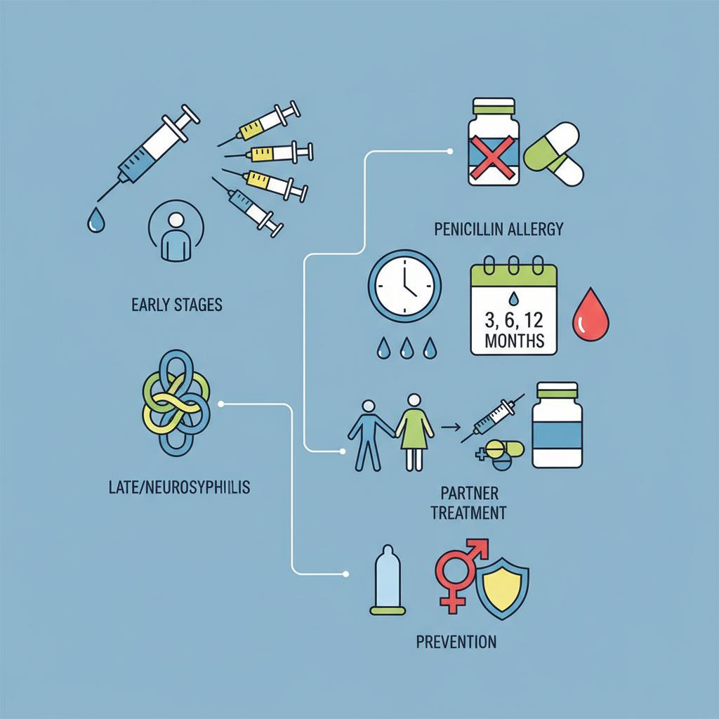 1기, 2기, 초기 잠복 매독은 한 번의 페니실린 근육 주사로 간단하게 치료될 수 있습니다. 하지만 후기 잠복 매독이나 3기 매독, 신경 매독의 경우, 1주 간격으로 3회 주사하거나 더 장기간의 입원 치료가 필요할 수 있습니다. 페니실린에 알레르기가 있는 경우, 전문의와 상의하여 독시사이클린, 세프트리악손 등 다른 항생제를 사용할 수 있습니다.