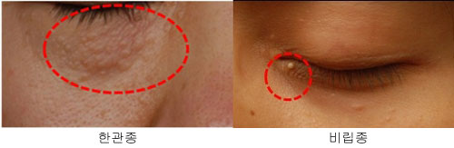 땀샘이 막혀서 생기는 투명하거나 살색의 돌기랍니다. 비립종과는 달리 땀샘 막힘이 원인이기 때문에, 아이크림 과다 사용이나 진한 아이메이크업이 한관종 발생에 영향을 줄 수 있다고 해요. 한관종과 비립종이 섞여 있는 경우도 많으니, 정확한 진단을 위해 피부과 전문의와 상담하는 것이 중요해요.