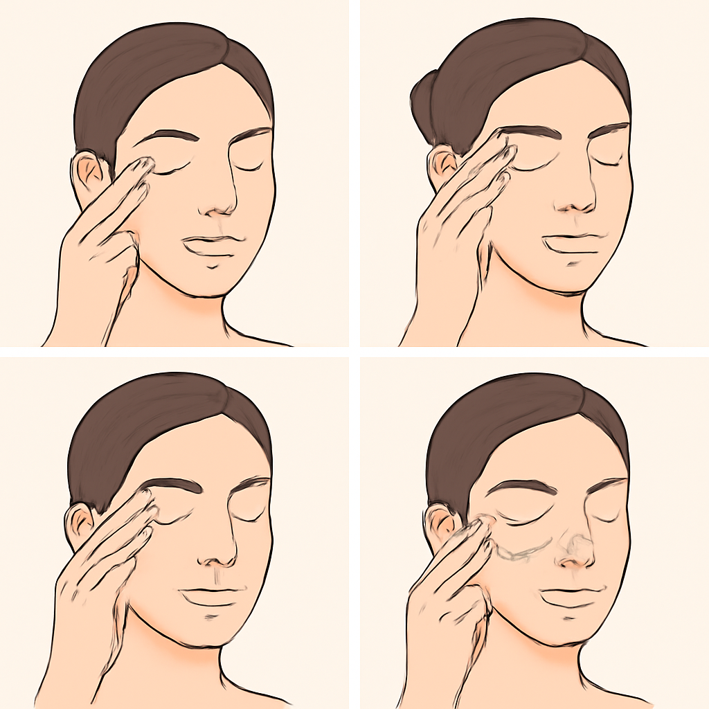 마사지를 할 때는 약지를 사용하여 눈꼬리에서 관자놀이 방향으로 부드럽게 3회 정도만 해주는 것이 좋아요. 피부가 예민할 때는 압을 낮추고, 절대 비비거나 긁지 않도록 주의해야 해요.