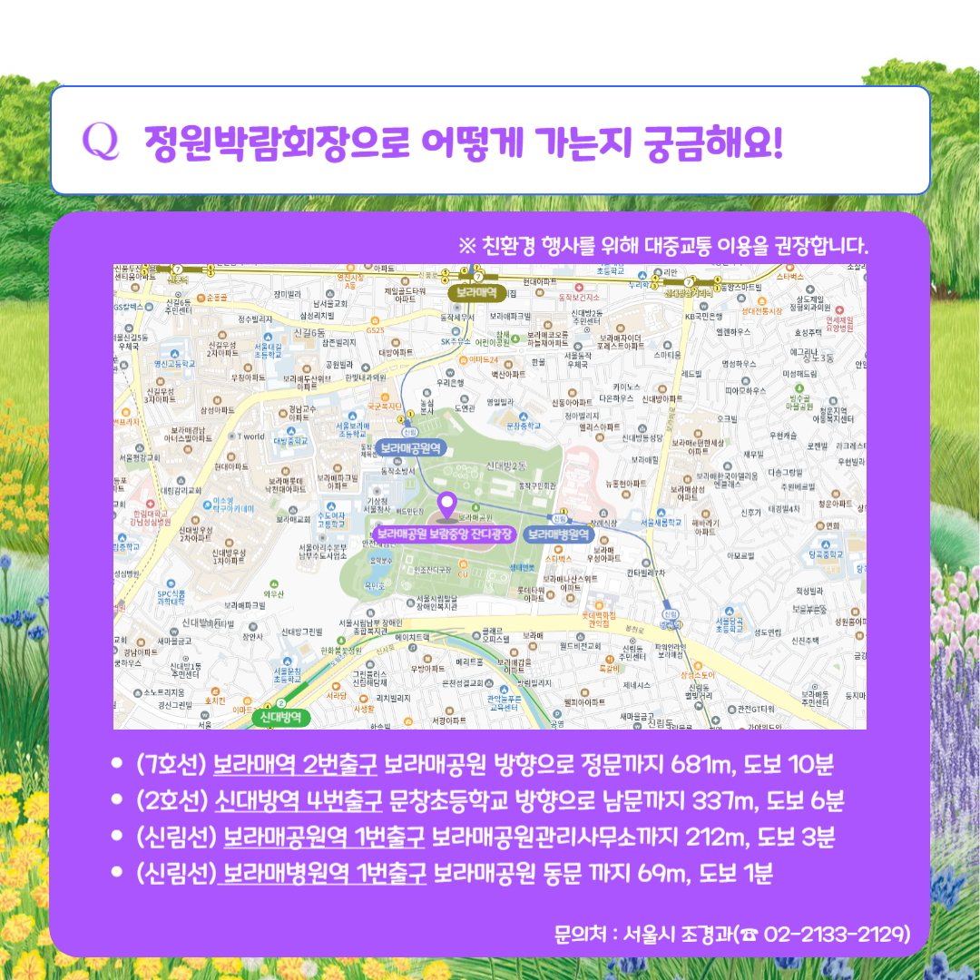 신림선 보라매공원역과 보라매병원역도 서울 국제정원박람회 방문에 편리하며, 각각 도보 3분과 1분 거리에 위치해 있습니다. 서울 국제정원박람회 입장료 무료 혜택으로 많은 방문객이 예상되므로, 대중교통 이용이 권장됩니다. 서울 국제정원박람회 기간 중에는 특별 셔틀버스도 운영되며, 이 역시 서울 국제정원박람회 입장료처럼 무료로 이용할 수 있습니다.