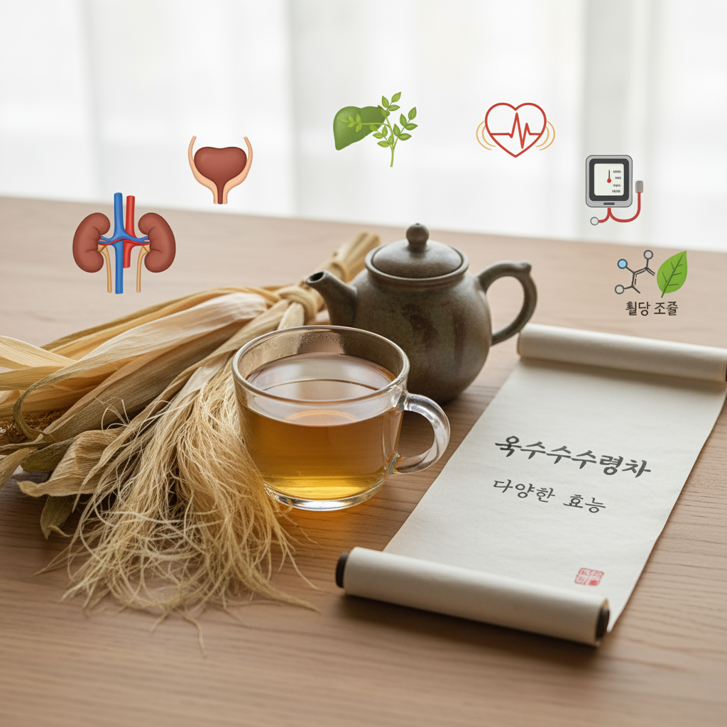 옥수수수염차는 이뇨 작용, 붓기 완화, 혈압 및 혈당 조절, 간 건강 개선, 피부 미용 등 다양한 효능이 있습니다.