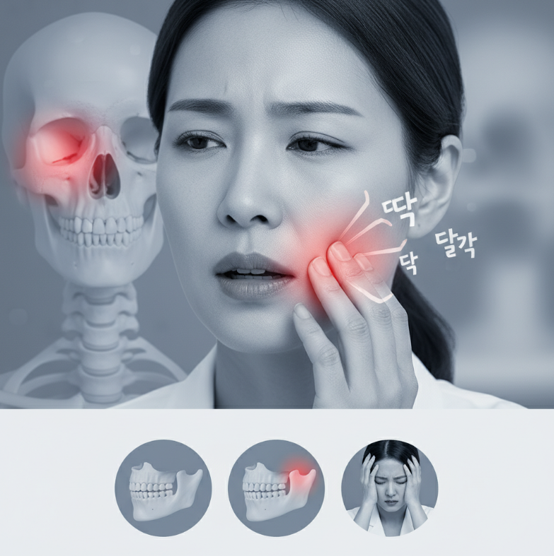 - 턱관절 질환: 디스크 변위, 관절염 등이 만성 통증과 '딱' 소리의 원인이 됩니다.