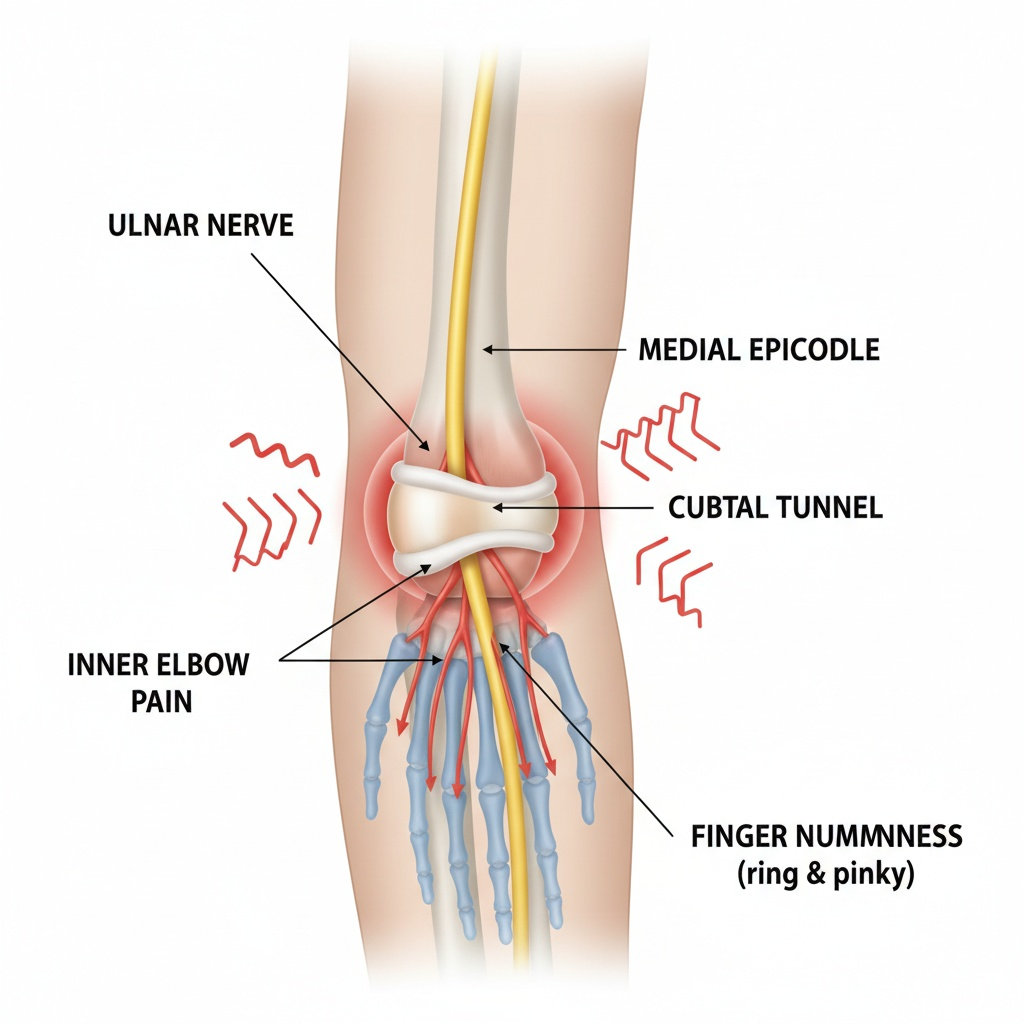 신경 압박은 팔꿈치 통증의 가장 중요하고 흔한 원인 중 하나입니다. 만약 팔꿈치 안쪽 통증과 4, 5번째 손가락 저림이 함께 나타난다면, '주관 증후군'을 강력히 의심해야 합니다.