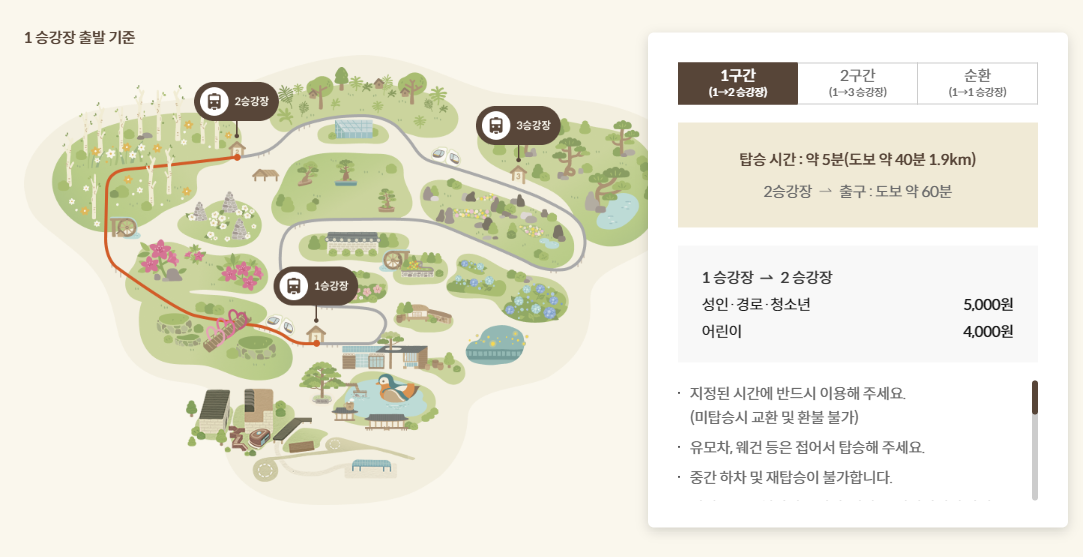 오를 때는 모노레일을 타고, 내려올 때는 천천히 걸어서 숲을 감상하는 코스를 추천해요. 1승강장에서 2승강장으로 가는 코스는 자작나무 숲 인근이라 특히 인기가 많답니다. 예약하기 전에 코스를 미리 정해보세요.