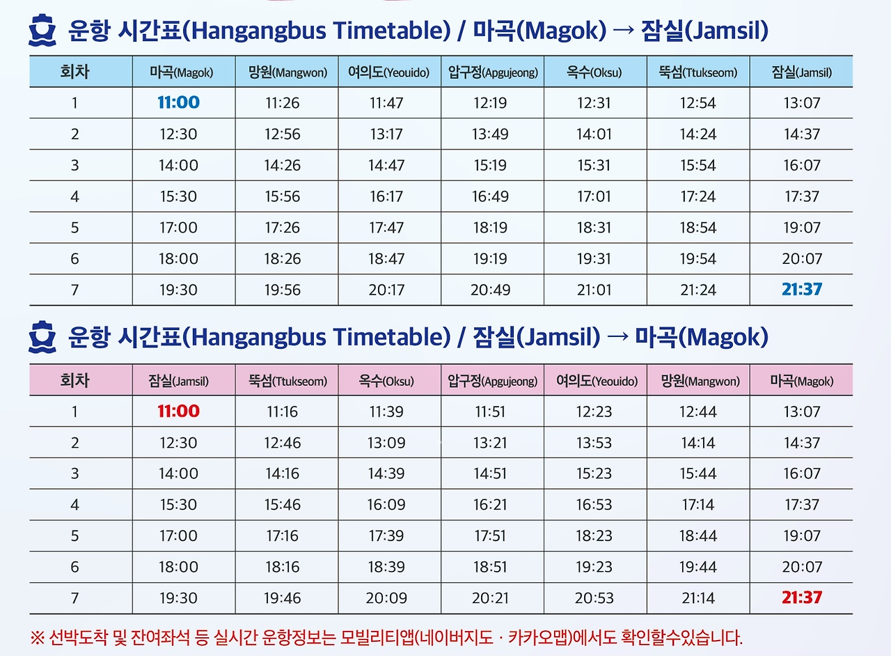 - 선착장별 운항시간 확인 필수